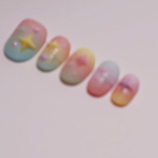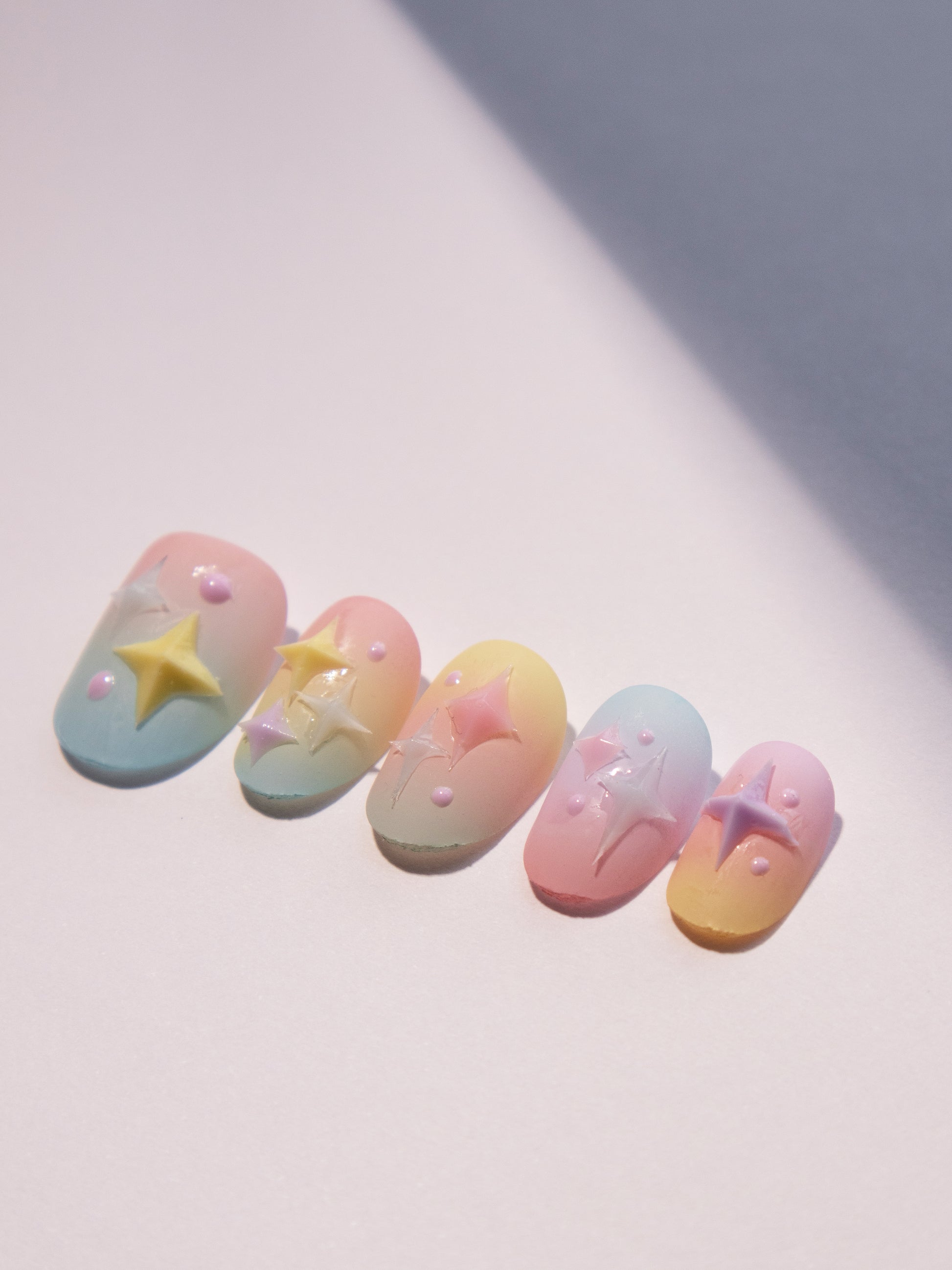 These baby pastel press ons whisper soft girl cozy from the matcha cafe next door. Matte baby pink, pastel blue, lavender, and daffodil tones accented with jelly sparkles. Made with premium gel, they’re durable, reusable, and designed to feel like custom luxury nails without the salon visit.