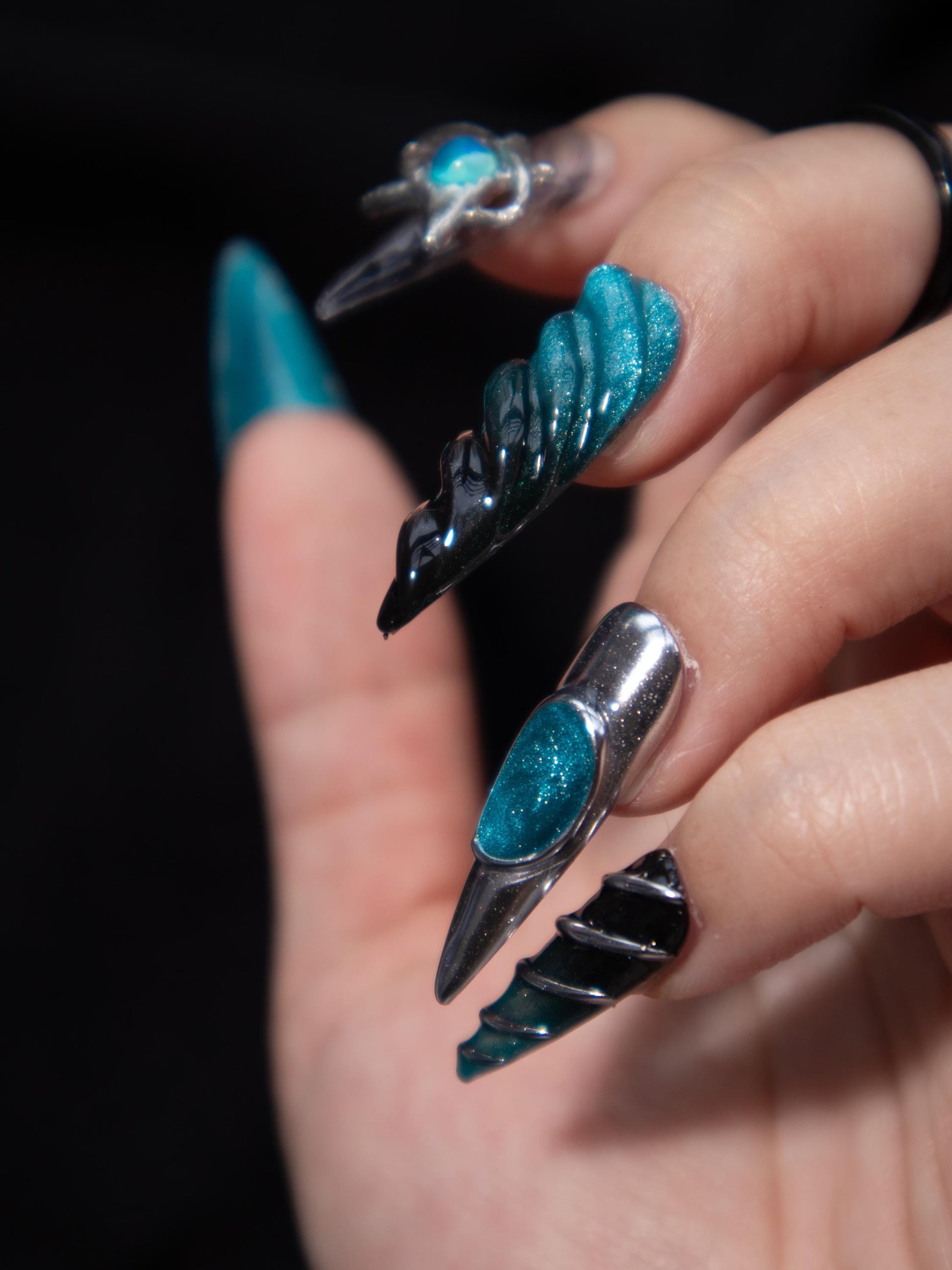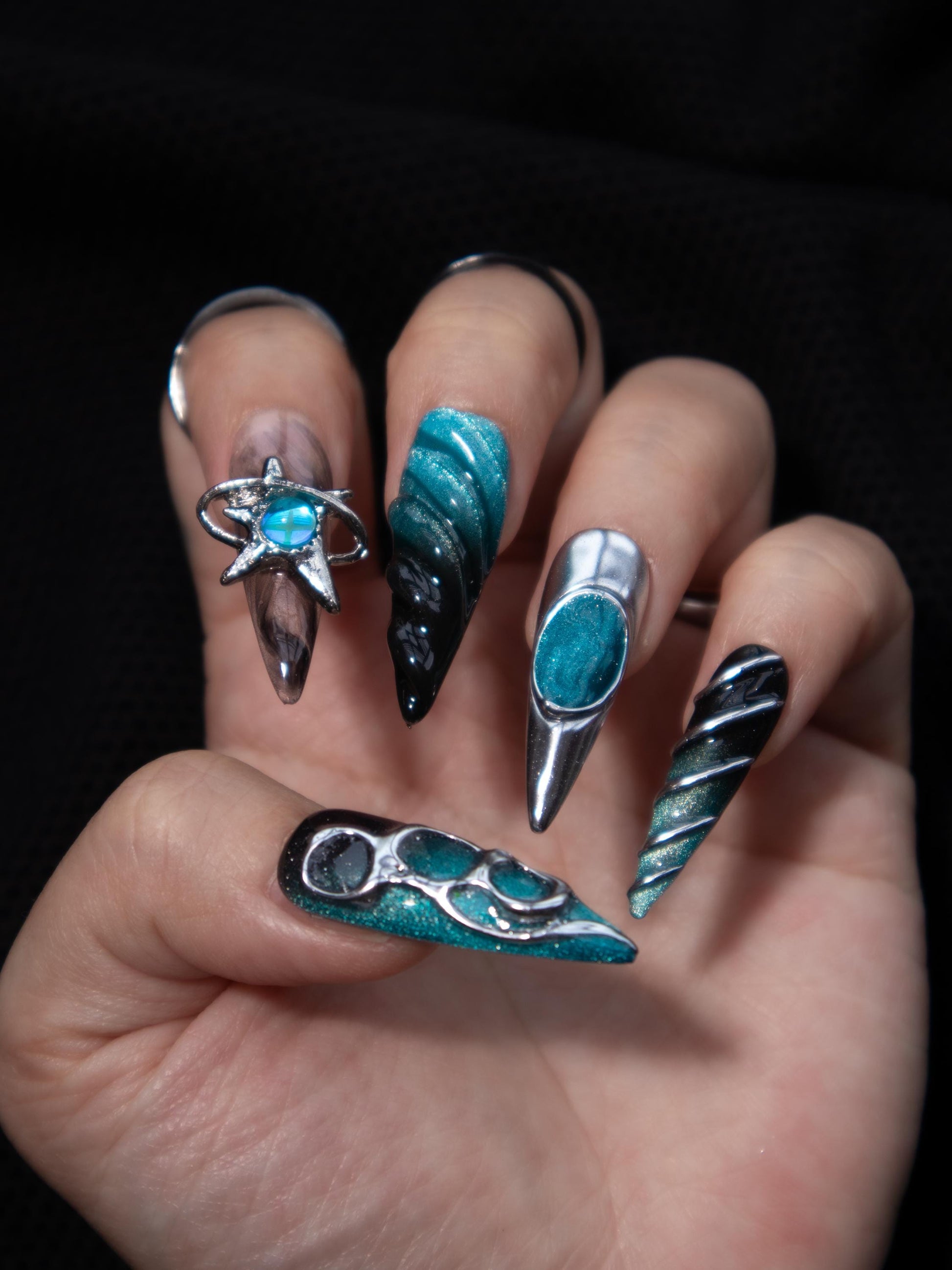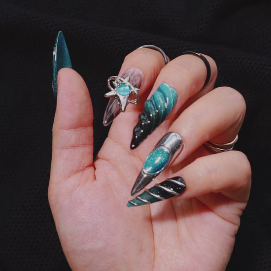 Go interdimensional with this Between Worlds press on nail set featuring a blue black gradient base, silver chrome details, and 3D effects. Made with premium gel, they’re durable, reusable, and designed to feel like custom luxury nails without the salon visit.