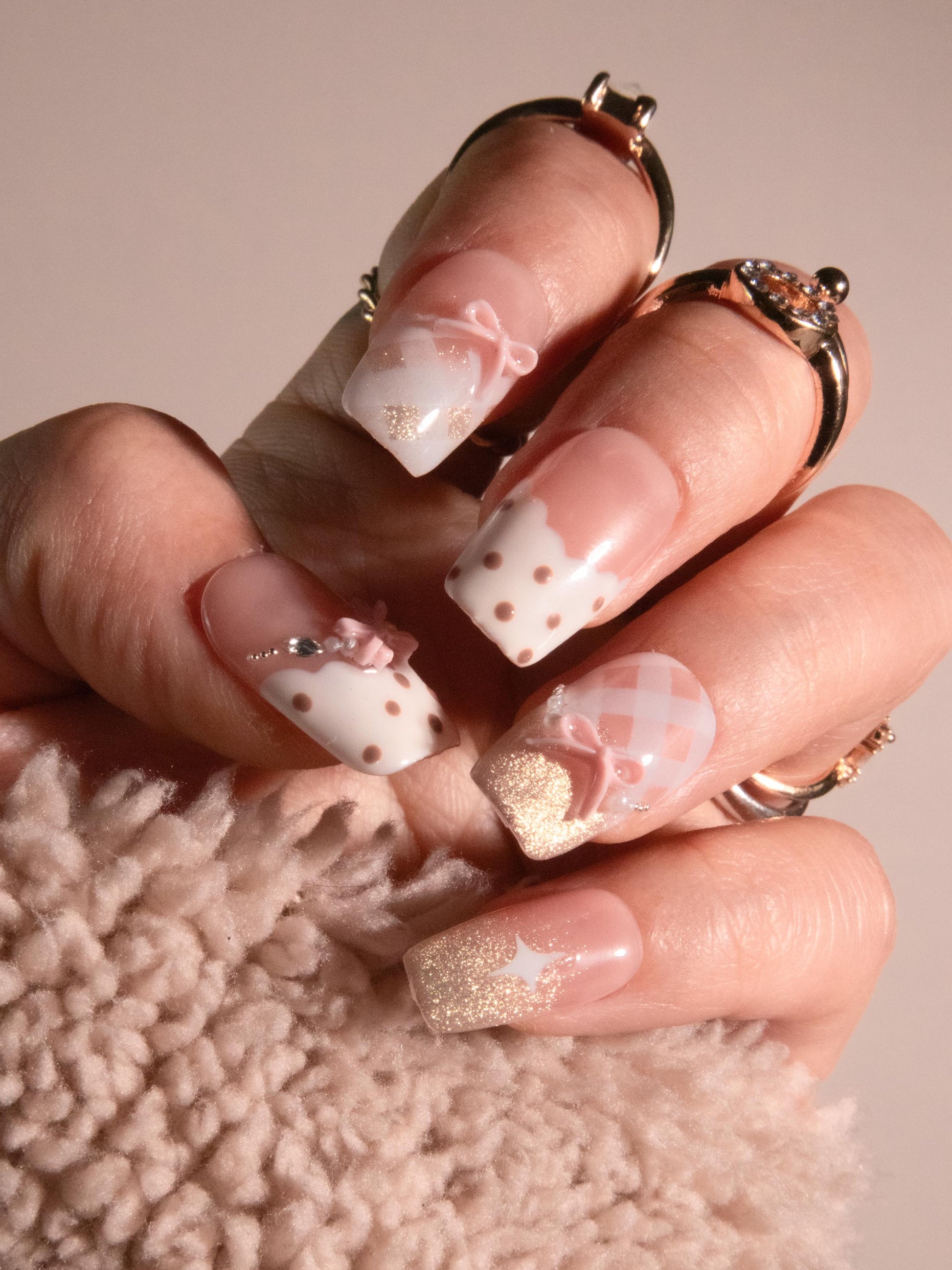 Think teddy cookies, but make it a press on nail set. Made with premium gel, coquette bow details, and gingham French tips, they’re durable, reusable, and designed to feel like custom luxury nails without the salon visit.