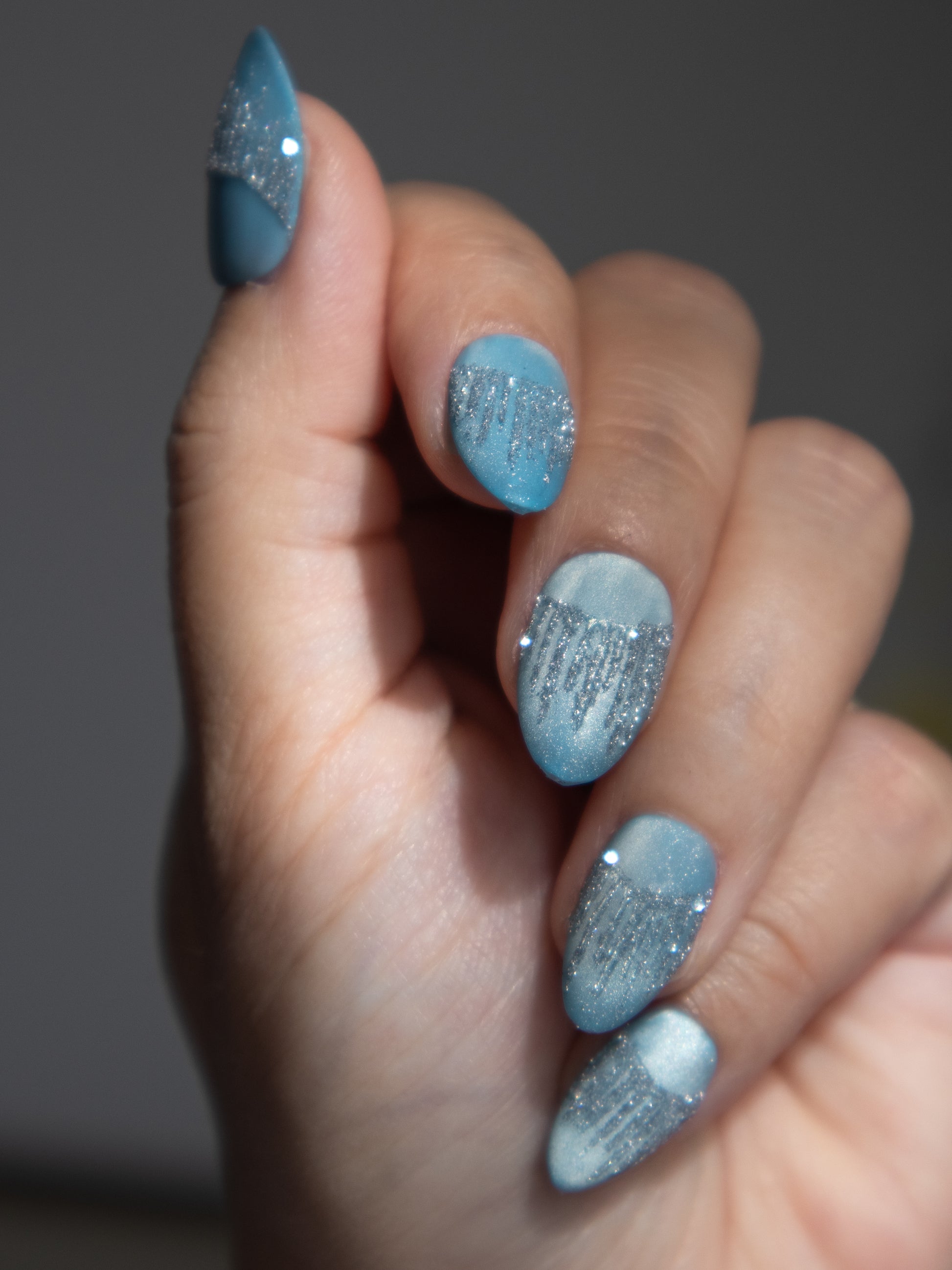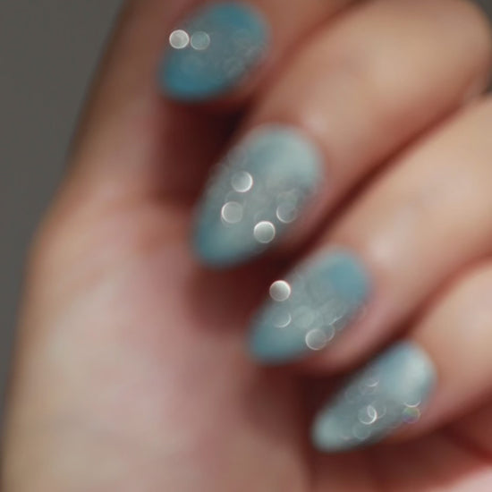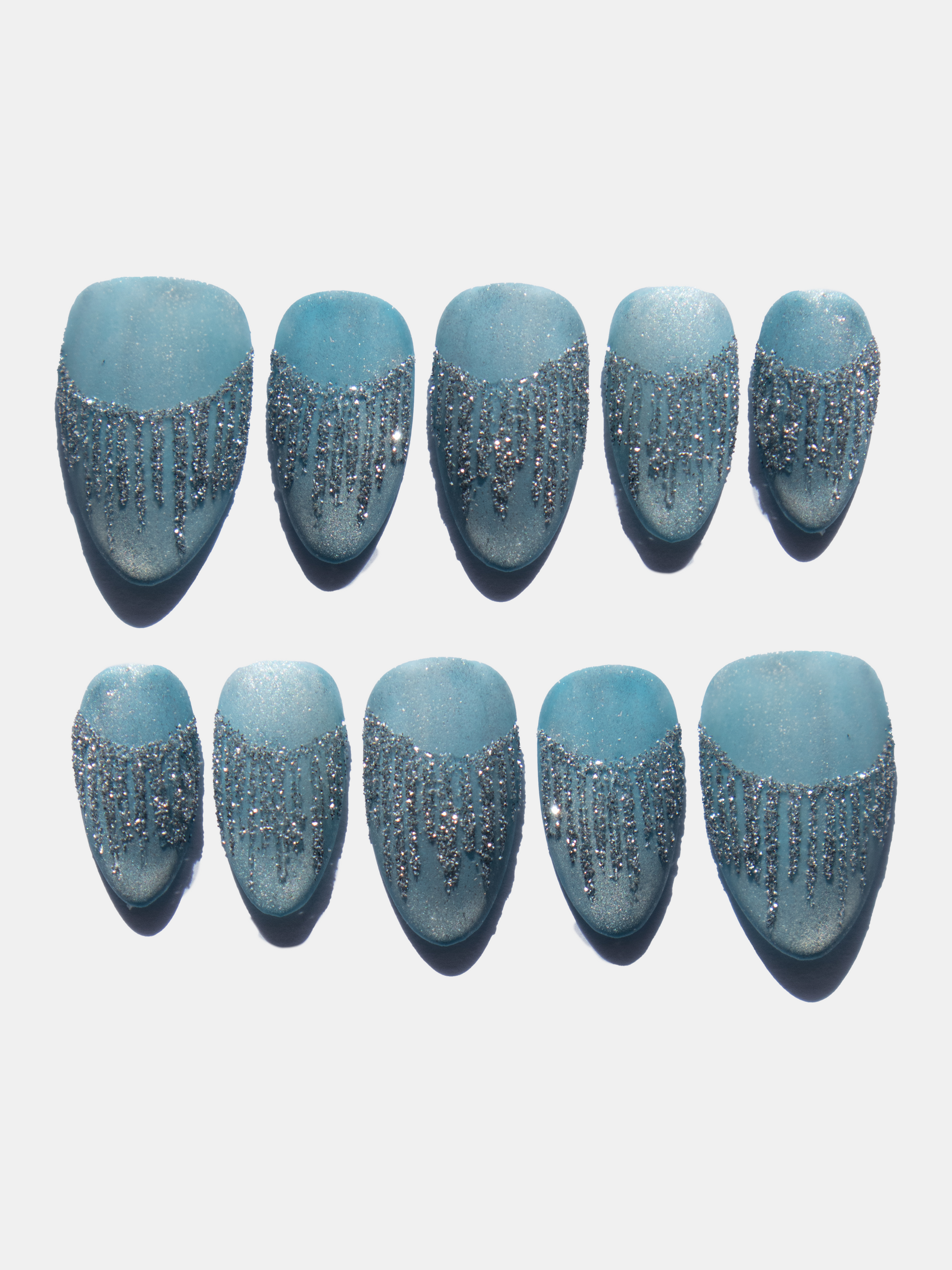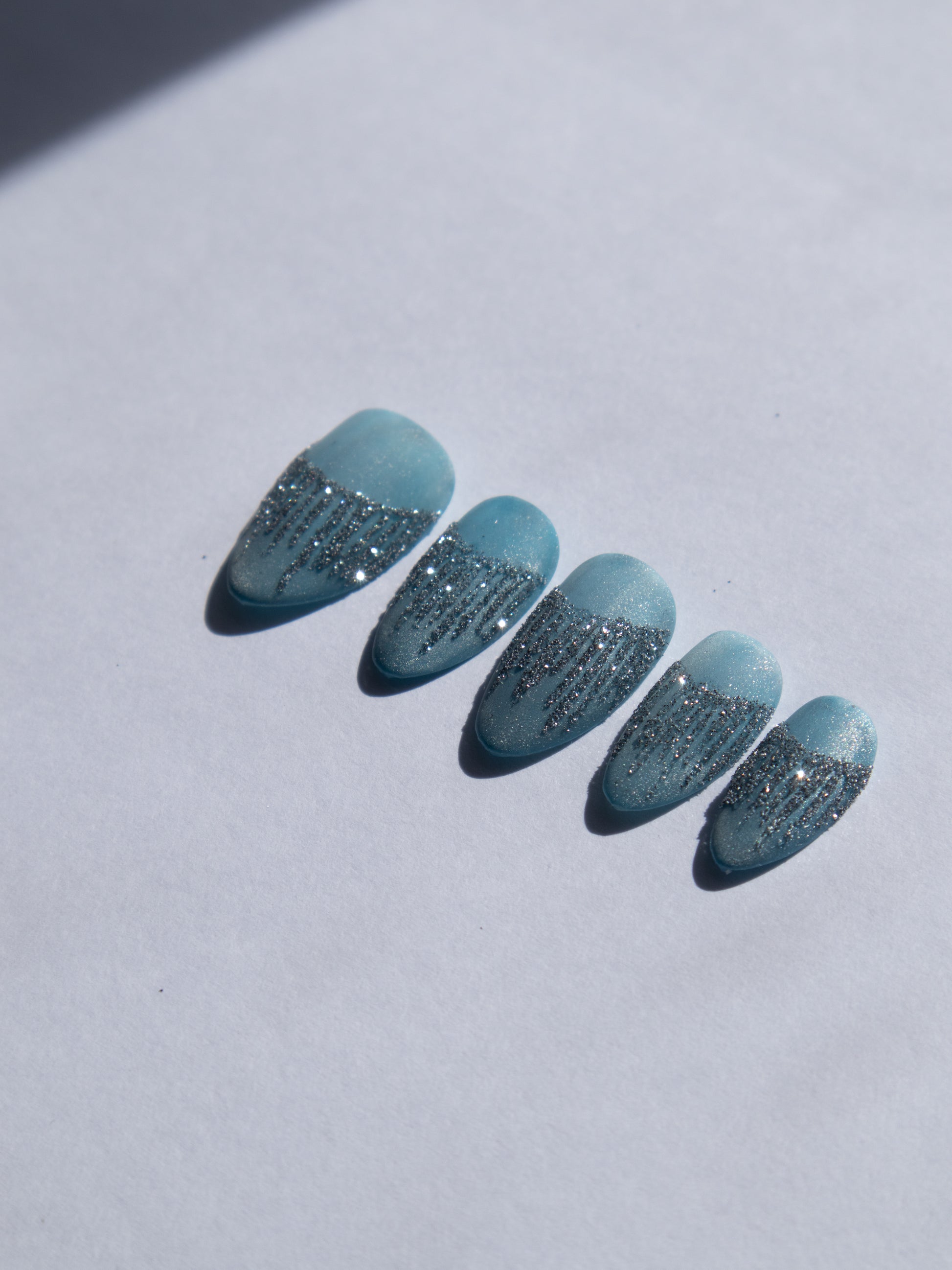 These frosted christmas press ons elevate the season with a touch of glam. Matte ice blue suede with glitter icing details. Made with premium gel, they’re durable, reusable, and designed to feel like custom luxury nails without the salon visit.