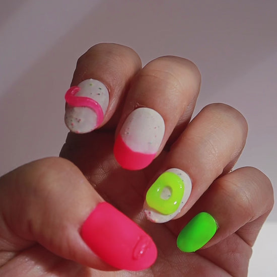 These neon jelly press ons add a vibrant pop of color to your nails. Neon pink, lime green, and stone white colors accented with 3D and matte effects. Made with premium gel, they’re durable, reusable, and designed to feel like custom luxury nails without the salon visit.
