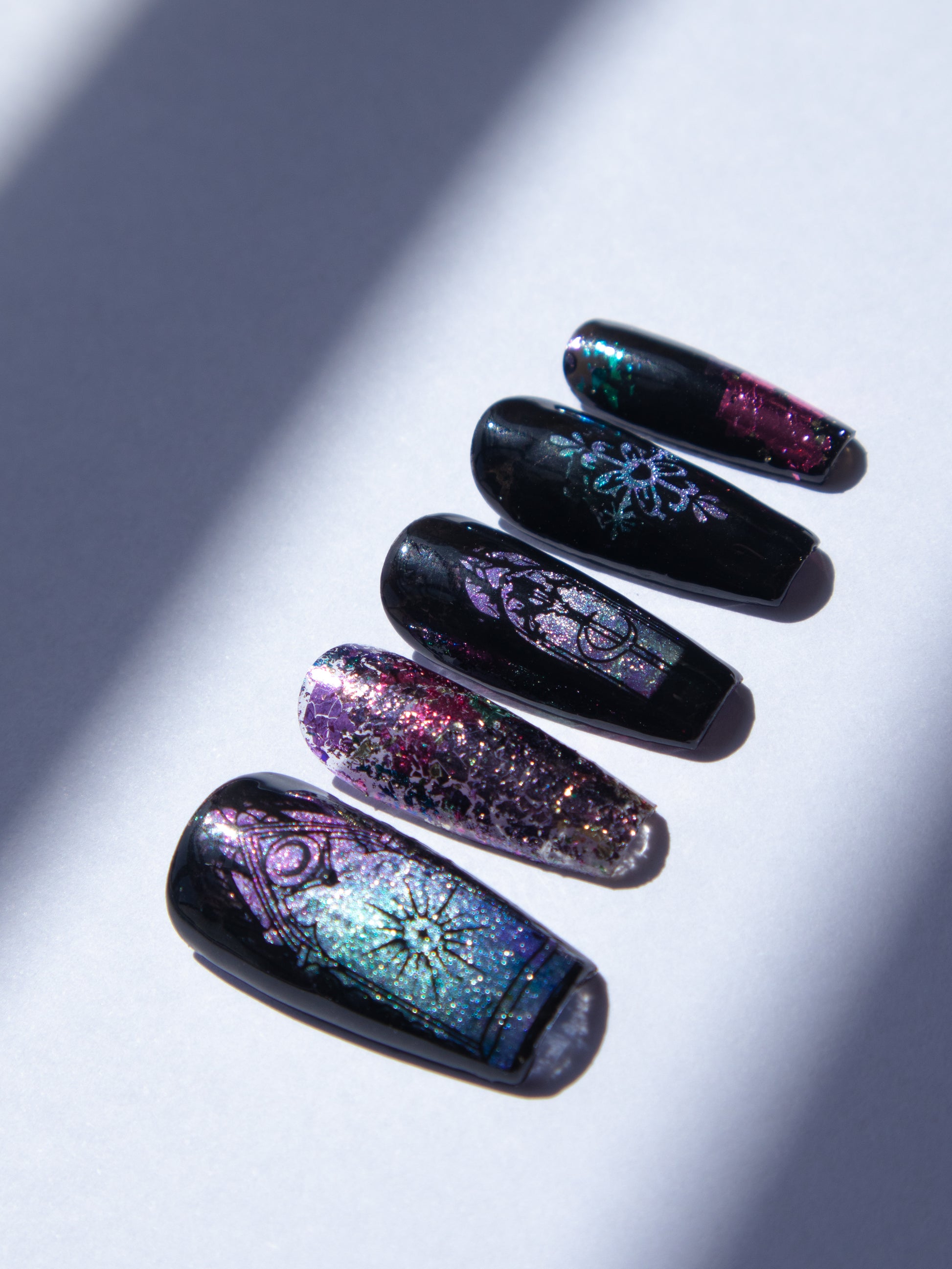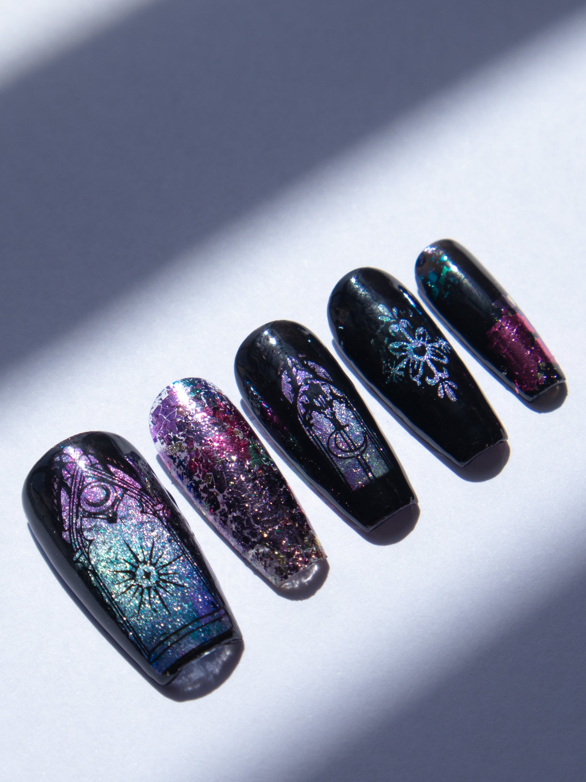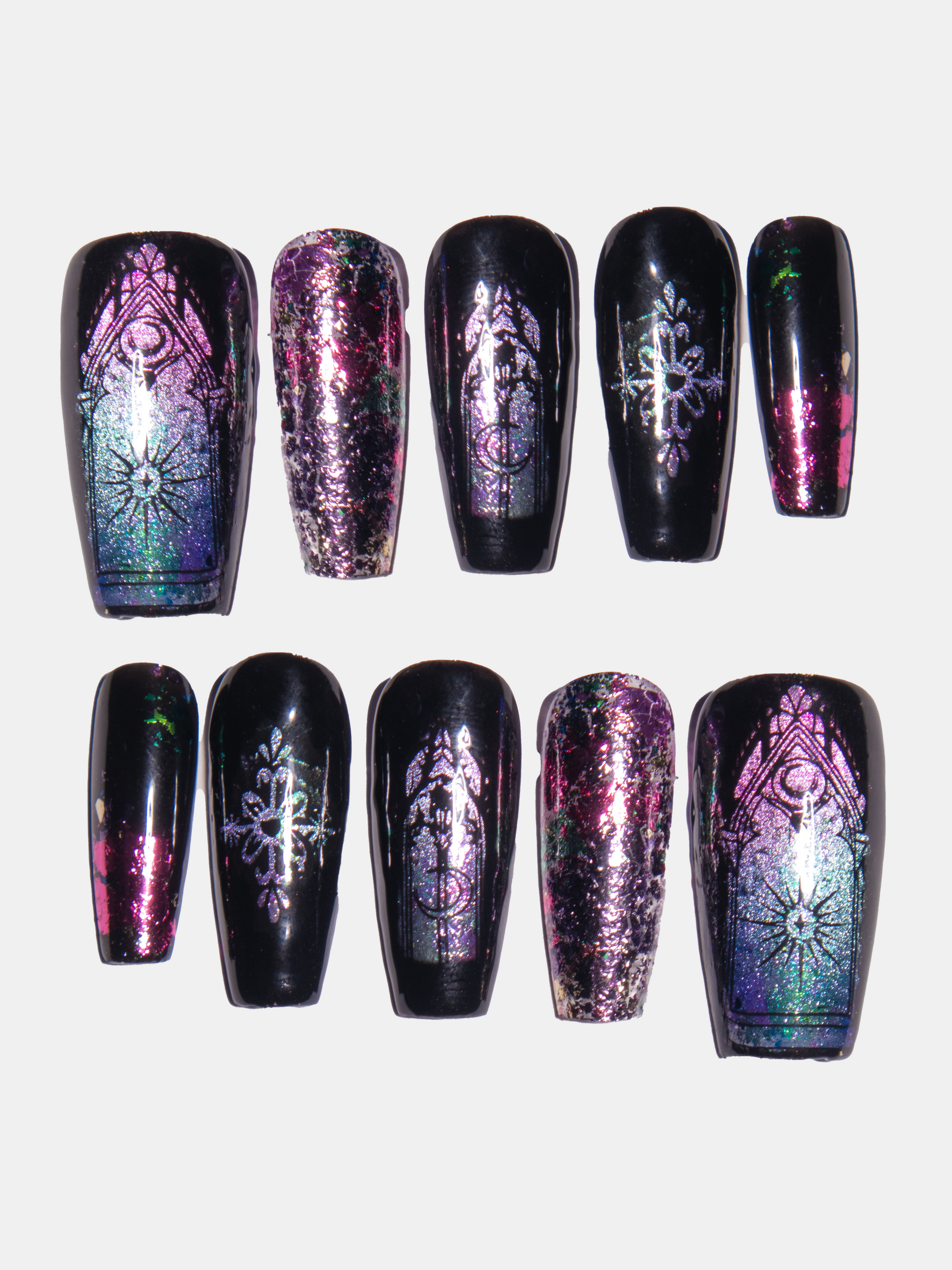 These magical glittery cathedral press ons lift your spirits this season. Perfect if you like your darkness with a bit of sparkle. Made with premium gel, they’re durable, reusable, and designed to feel like custom luxury nails without the salon visit.
