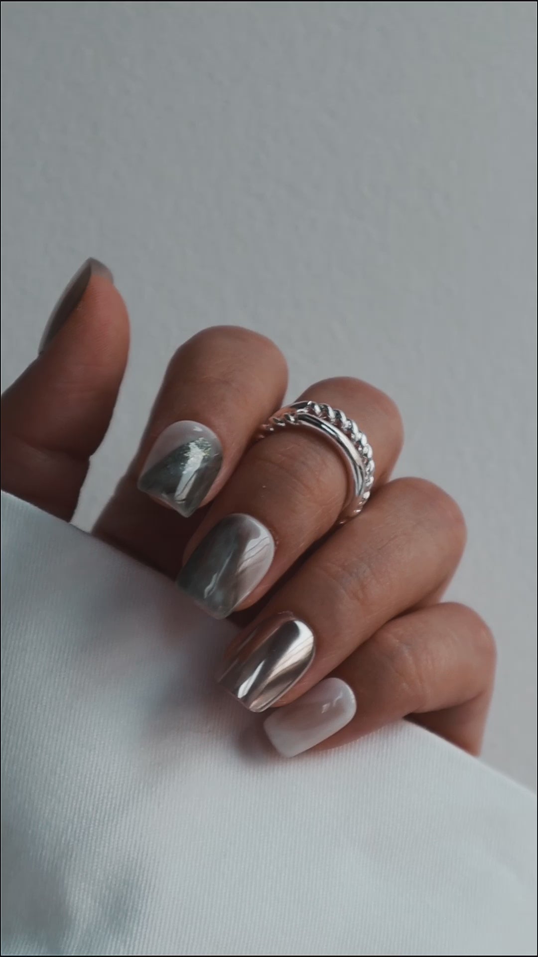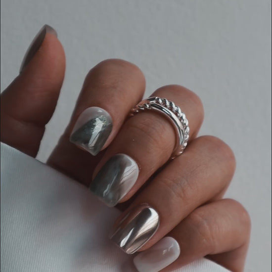 These mirror chrome marble nails add the perfect edge to minimalist looks. Made with premium gel, they’re durable, reusable, and designed to feel like custom luxury nails without the salon visit.