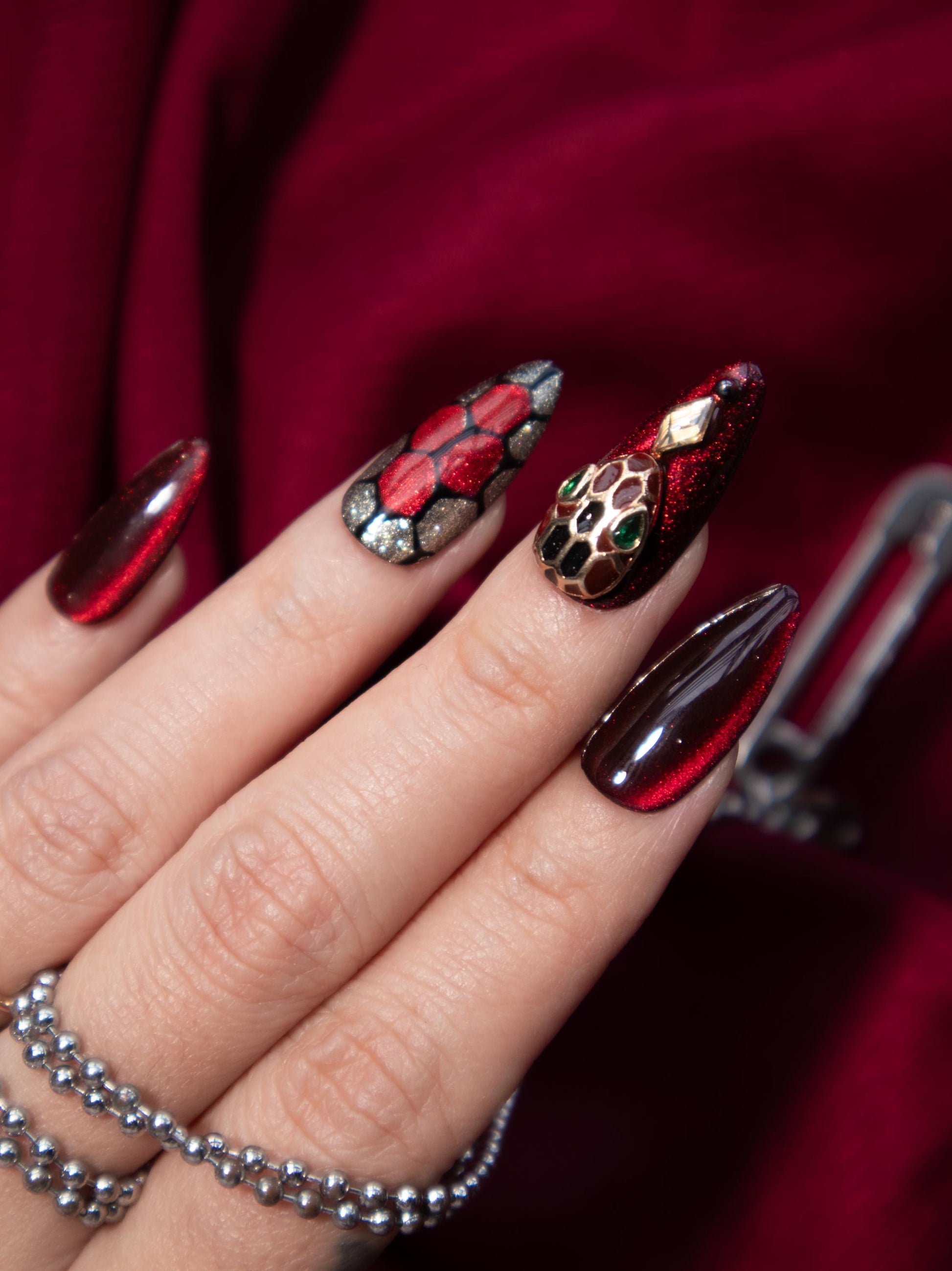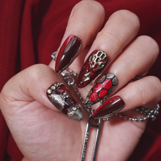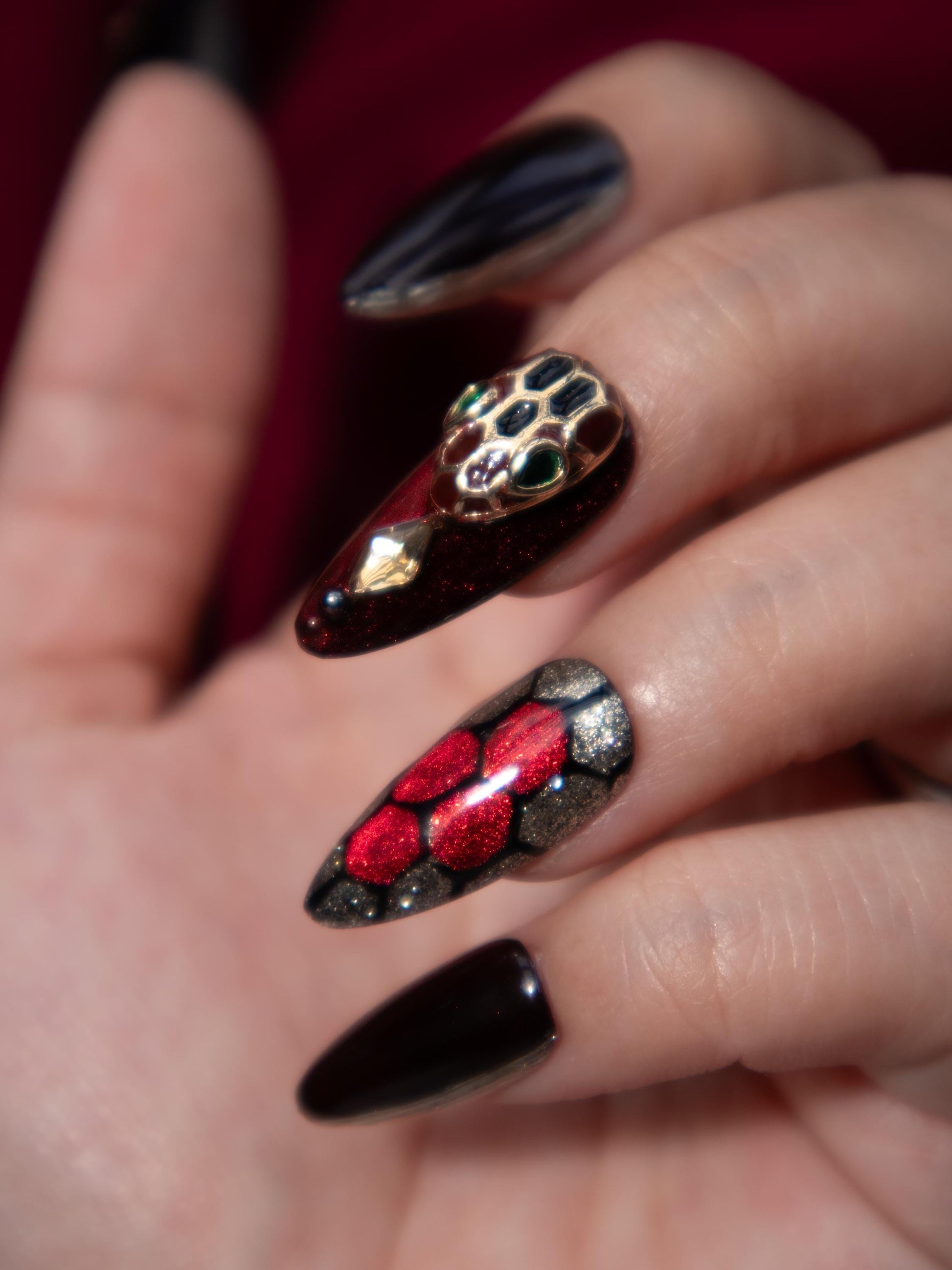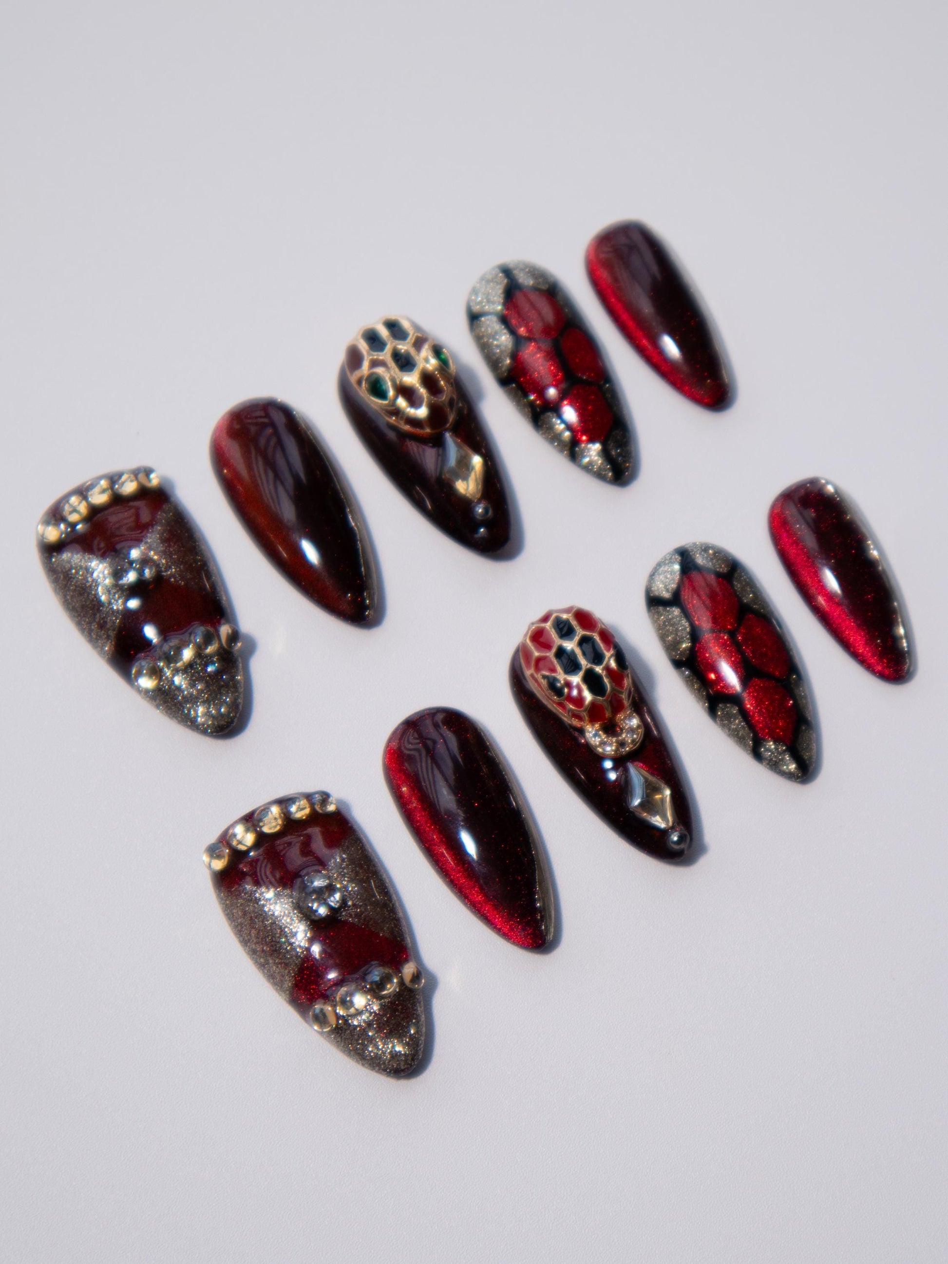 Spook away with these red viper press on nails this Halloween. Deep scarlet black cat eye base with intricate gold snake 3D and glitter effects. Made with premium gel, they’re durable, reusable, and designed to feel like custom luxury nails without the salon visit.
