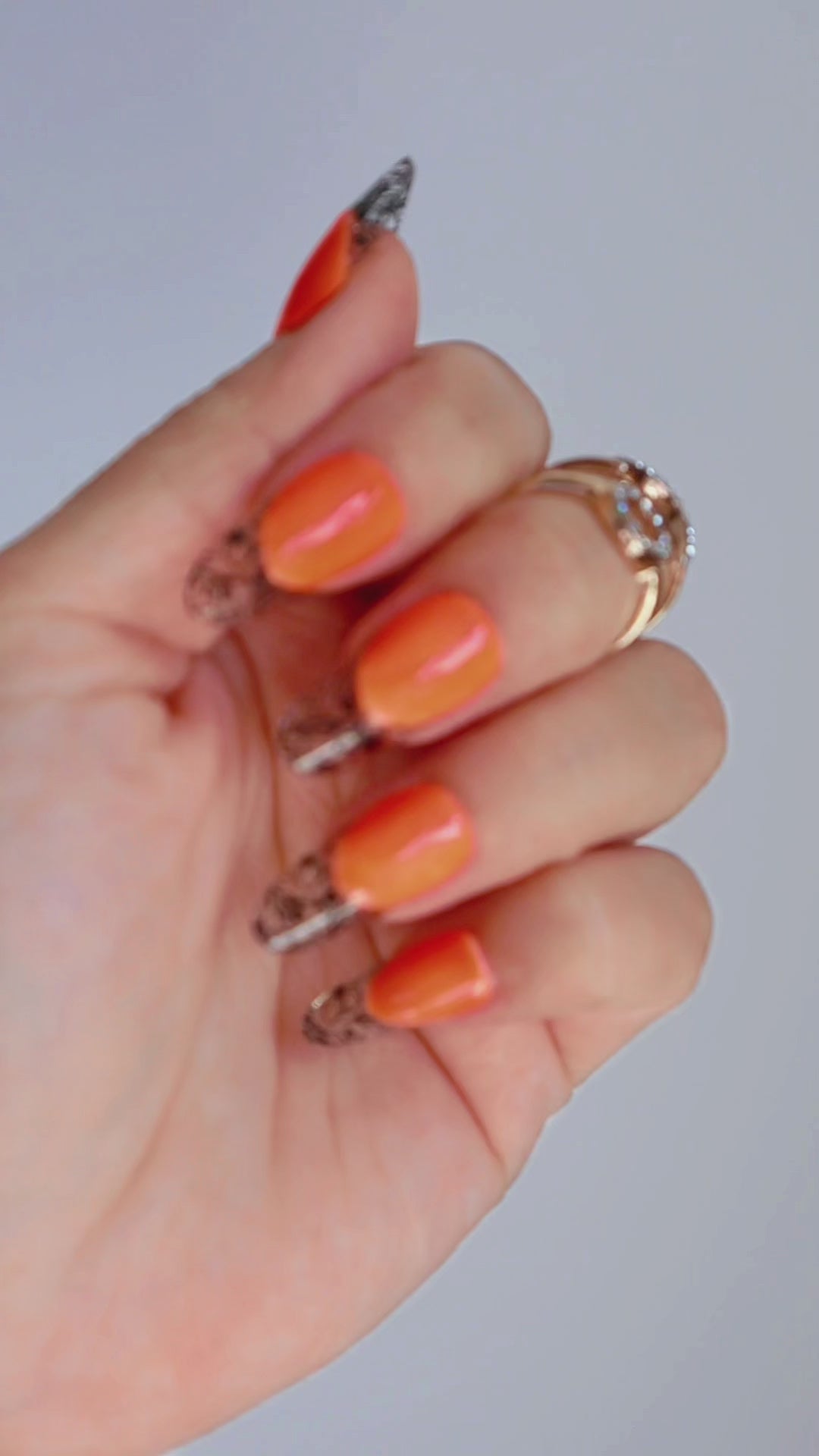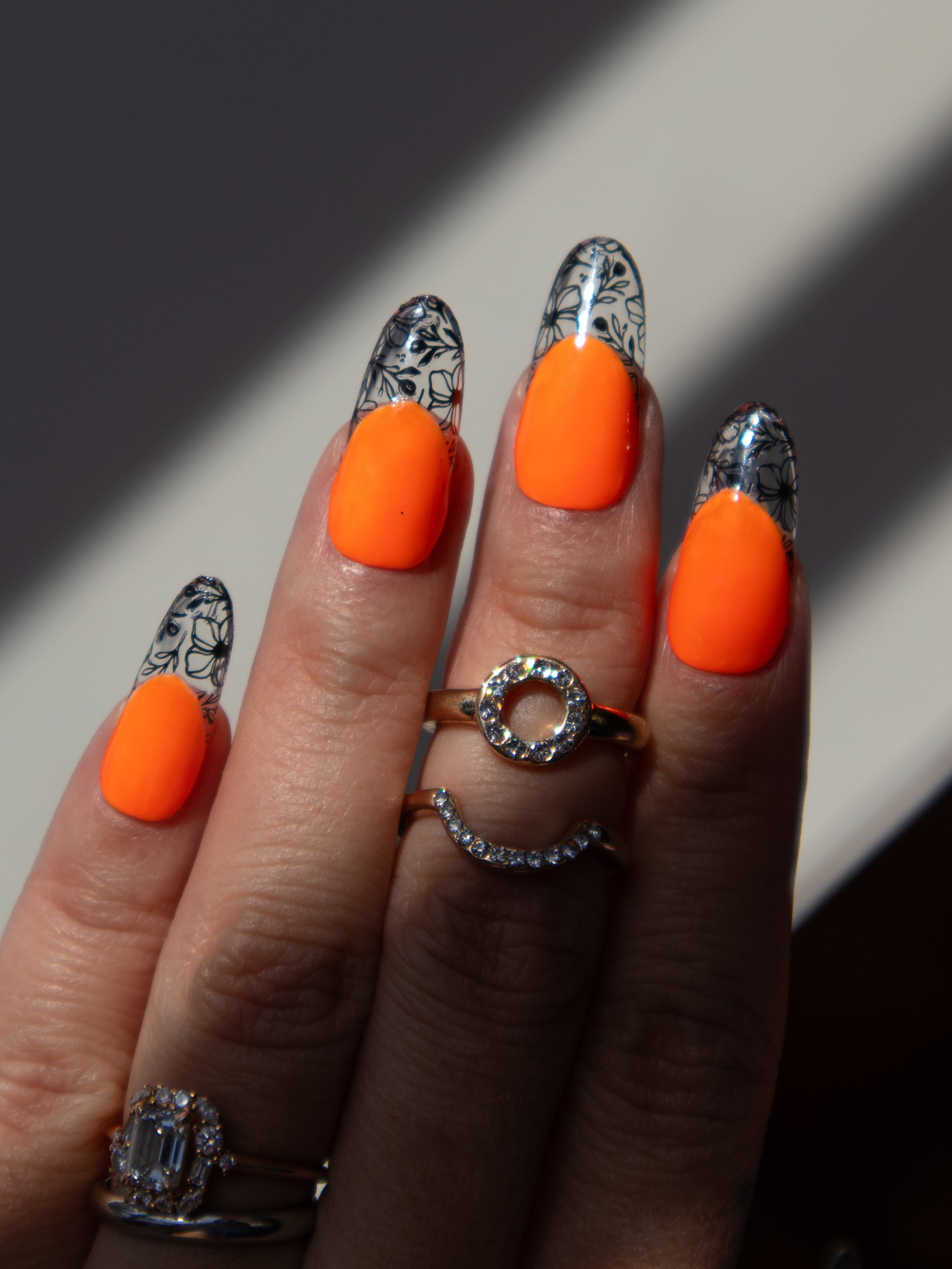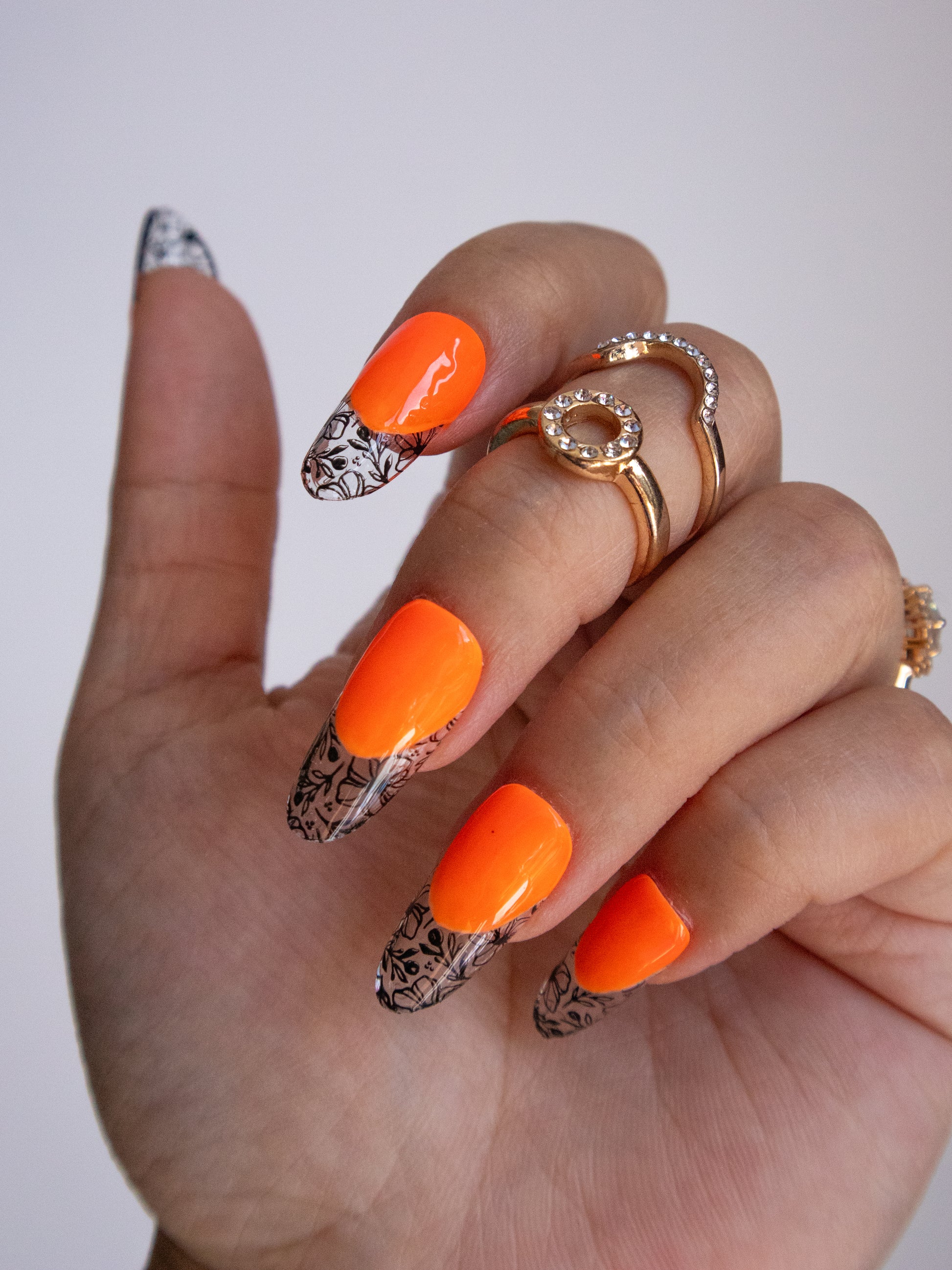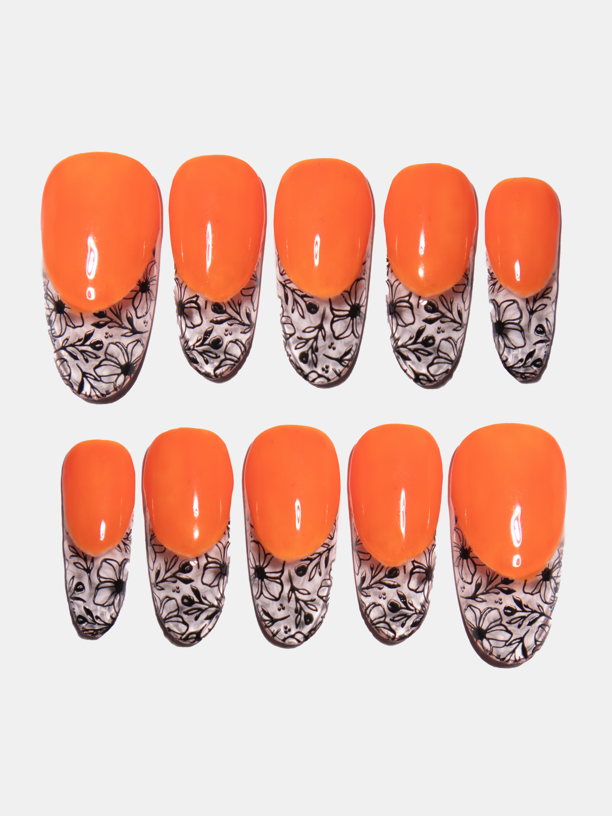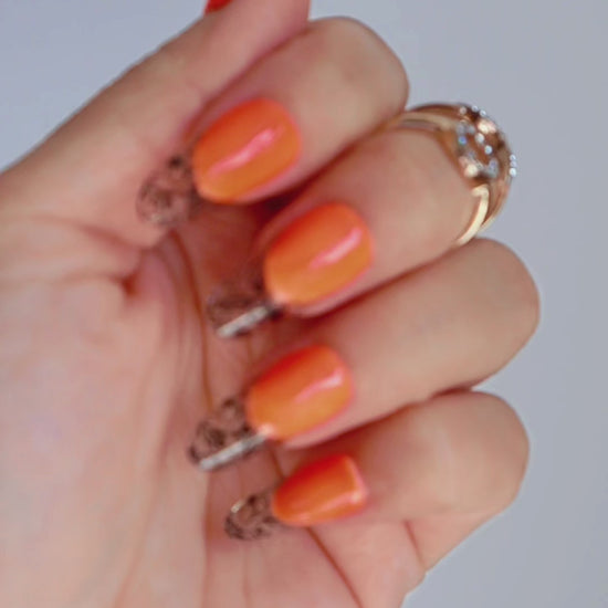 These whimsical press ons add a vibrant pop of color to your nails. Neon orange base with a black vintage floral French tip. Made with premium gel, they’re durable, reusable, and designed to feel like custom luxury nails without the salon visit.