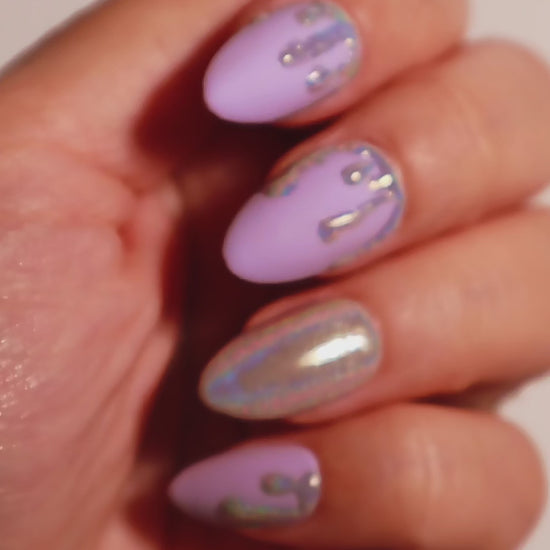 These unicorn tears press ons are so cute and gnarly at the same time. Pastel purple gets an edge with matte and holographic chrome details. Made with premium gel, they’re durable, reusable, and designed to feel like custom luxury nails without the salon visit.